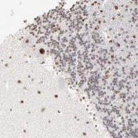 Immunohistochemical staining of human cerebellum shows strong nuclear positivity in Purkinje cells and cells in molecular layer.