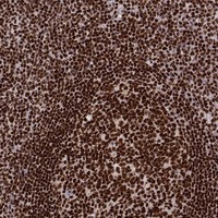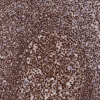 Immunohistochemical staining of human tonsil shows strong nuclear positivity in germinal center cells and non-germinal center cells.