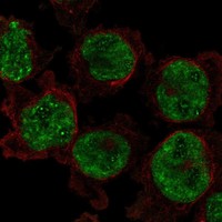 Immunofluorescent staining of human cell line A-431 shows localization to nucleoplasm.