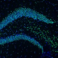 Immunohistochemical staining of human cerebellum shows strong nuclear positivity in Purkinje cells.