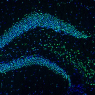 Widespread and general moderate-intensity neuronal somatic immunostaining is noticed throughout the entire brain. The staining is predominantly nuclear but also, less intensely, cytoplasmic.