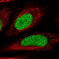 Immunofluorescent staining of human cell line HeLa shows localization to nucleoplasm.