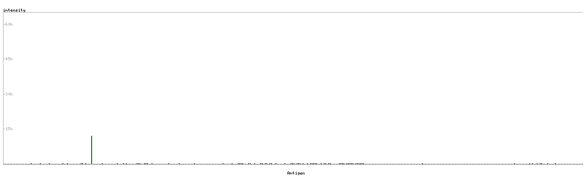 At the top of the view, the position of the antigen (identified by the corresponding HPA identifier) is shown as a green bar. A yellow triangle on the bar indicates a <100% sequence identity to the protein target.