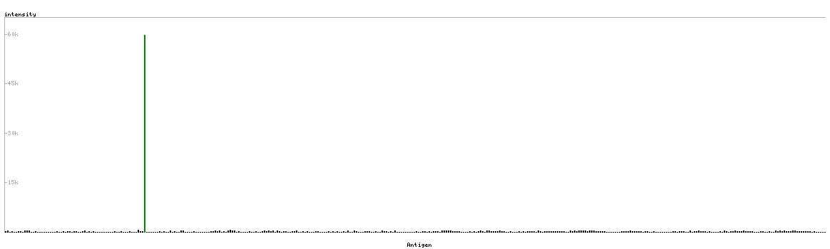 At the top of the view, the position of the antigen (identified by the corresponding HPA identifier) is shown as a green bar. A yellow triangle on the bar indicates a <100% sequence identity to the protein target.