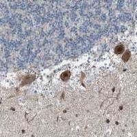 Immunohistochemical staining of human cerebellum shows nuclear and cytoplasmic positivity in Purkinje and molecular layer cells.