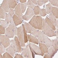 Immunohistochemical staining of human skeletal muscle shows moderate positivity in myocytes.
