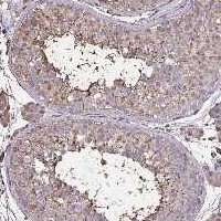 Immunohistochemical staining of human testis shows moderate cytoplasmic positivity in cells in seminiferus ducts.