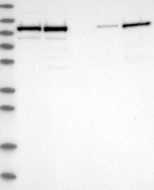 A Western blot analysis is performed on a panel of human tissues and cell lines to evaluate antibody specificity. For antibodies with unreliable result a revalidation using an over-expression lysate is performed.