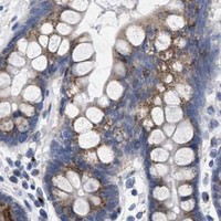 Immunohistochemical staining of human duodenum shows moderate cytoplasmic positivity in glandular cells.