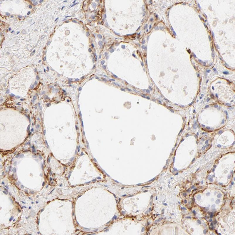 Immunohistochemical staining of human thyroid gland shows positivity in extracellular matrix of glandular cells.