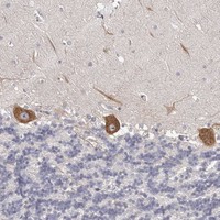 Immunohistochemical staining of human cerebellum shows strong cytoplasmic positivity in purkinje cells.
