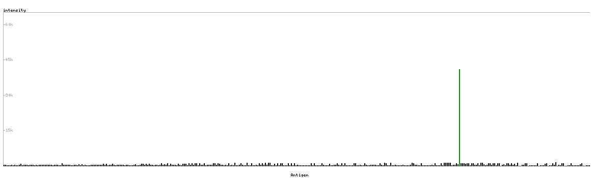 At the top of the view, the position of the antigen (identified by the corresponding HPA identifier) is shown as a green bar. A yellow triangle on the bar indicates a <100% sequence identity to the protein target.