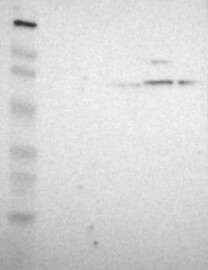 Band of predicted size in kDa (+/-20%) with additional bands present.