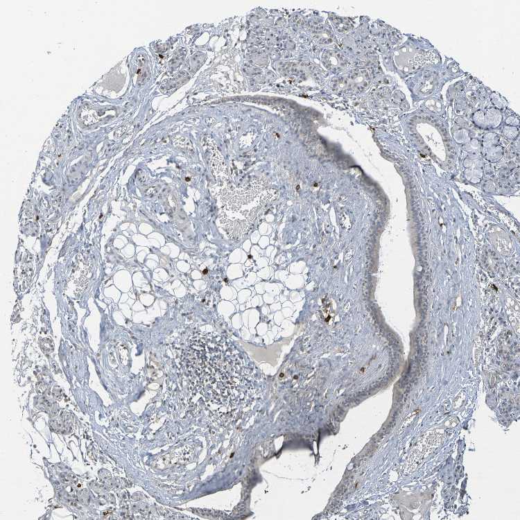Antibody staining in the annotated cell types in the current human tissue is reported as not detected, low, medium, or high, based on conventional immunohistochemistry profiling in selected tissues. This score is based on the combination of the staining intensity and fraction of stained cells.