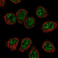 Immunofluorescent staining of human cell line HEL shows localization to nuclear speckles.