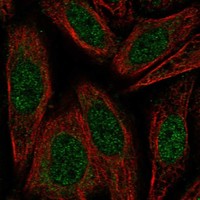 Immunofluorescent staining of human cell line SiHa shows localization to nucleoplasm.