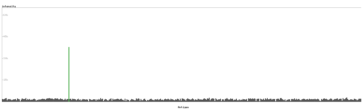 At the top of the view, the position of the antigen (identified by the corresponding HPA identifier) is shown as a green bar. A yellow triangle on the bar indicates a <100% sequence identity to the protein target.