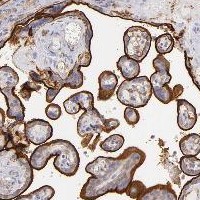 Immunohistochemical staining of human placenta shows luminal positivity.