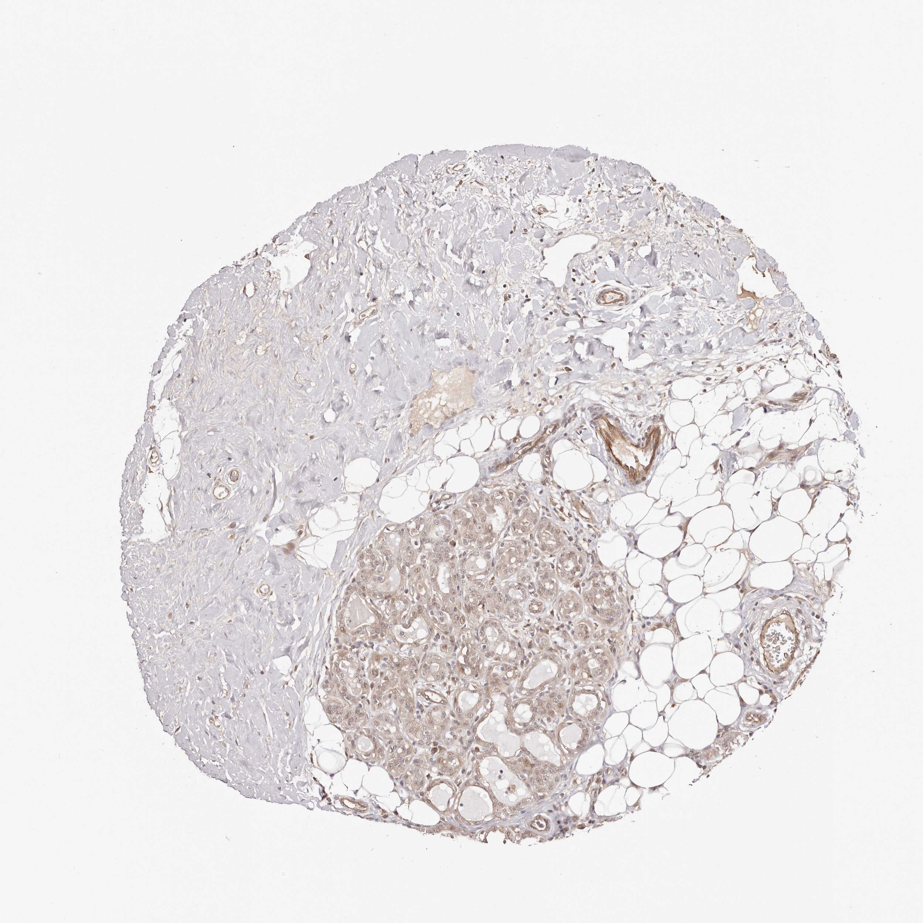 Antibody staining in the annotated cell types in the current human tissue is reported as not detected, low, medium, or high, based on conventional immunohistochemistry profiling in selected tissues. This score is based on the combination of the staining intensity and fraction of stained cells.