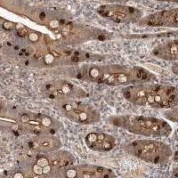 Immunohistochemical staining of human duodenum shows moderate granular cytoplasmic positivity in glandular cells.