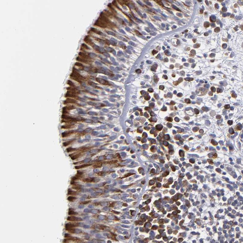 Immunohistochemical staining of human nasopharynx shows strong cytoplasmic positivity in respiratory epithelial cells.