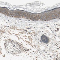 Immunohistochemical staining of human skin shows moderate cytoplasmic positivity.