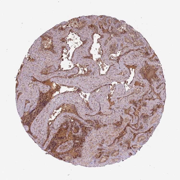 Antibody staining in the annotated cell types in the current human tissue is reported as not detected, low, medium, or high, based on conventional immunohistochemistry profiling in selected tissues. This score is based on the combination of the staining intensity and fraction of stained cells.