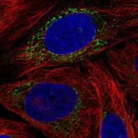 Immunofluorescent staining of human cell line U2OS shows localization to mitochondria.