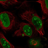 Immunofluorescent staining of human cell line U2OS shows localization to nucleoplasm and nucleoli.