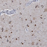 Immunofluorescent staining of human cell line U2OS shows localization to nuclear speckles.