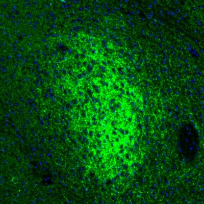 Moderate-strong axonal and diffuse-synaptic immunoreactivity is observed in selected regions of the brain, most abundant in the shall of nucleus accumbens, multiple nuclei of the BNST, suprachiasmatic nucleus, strial terminalis, (central) amygdala, inner molecular layer of the dentate gyrus and the medullar parabrachial nucleus.
