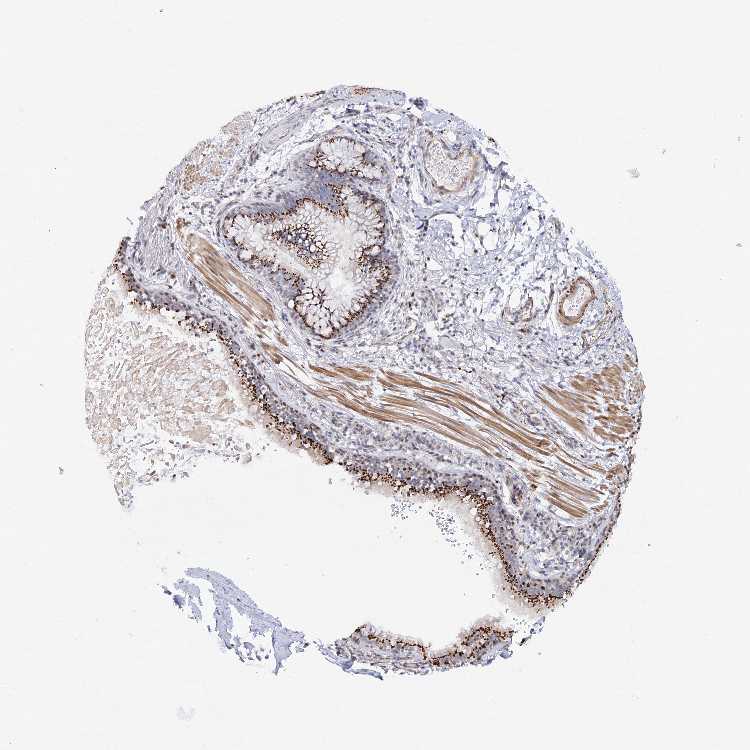 Antibody staining in the annotated cell types in the current human tissue is reported as not detected, low, medium, or high, based on conventional immunohistochemistry profiling in selected tissues. This score is based on the combination of the staining intensity and fraction of stained cells.