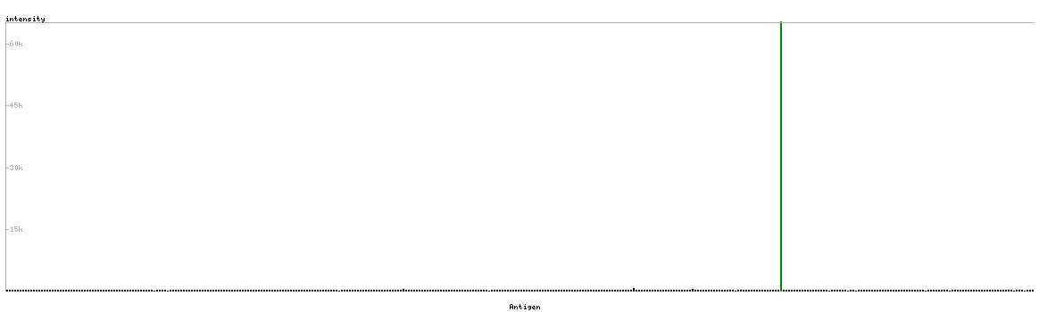 At the top of the view, the position of the antigen (identified by the corresponding HPA identifier) is shown as a green bar. A yellow triangle on the bar indicates a <100% sequence identity to the protein target.