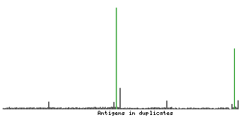 At the top of the view, the position of the antigen (identified by the corresponding HPA identifier) is shown as a green bar. A yellow triangle on the bar indicates a <100% sequence identity to the protein target.