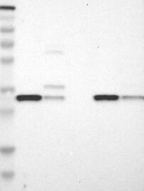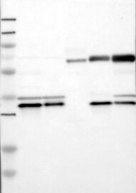 A Western blot analysis is performed on a panel of human tissues and cell lines to evaluate antibody specificity. For antibodies with unreliable result a revalidation using an over-expression lysate is performed.