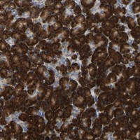 Immunohistochemical staining of human pancreas shows strong cytoplasmic positivity in exocrine glandular cells.