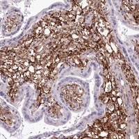 Immunohistochemical staining of human placenta shows cytoplasmic positivity in stromal cells.
