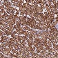 Immunohistochemical staining of human kidney shows strong membranous and cytoplasmic positivity in cells in tubules.