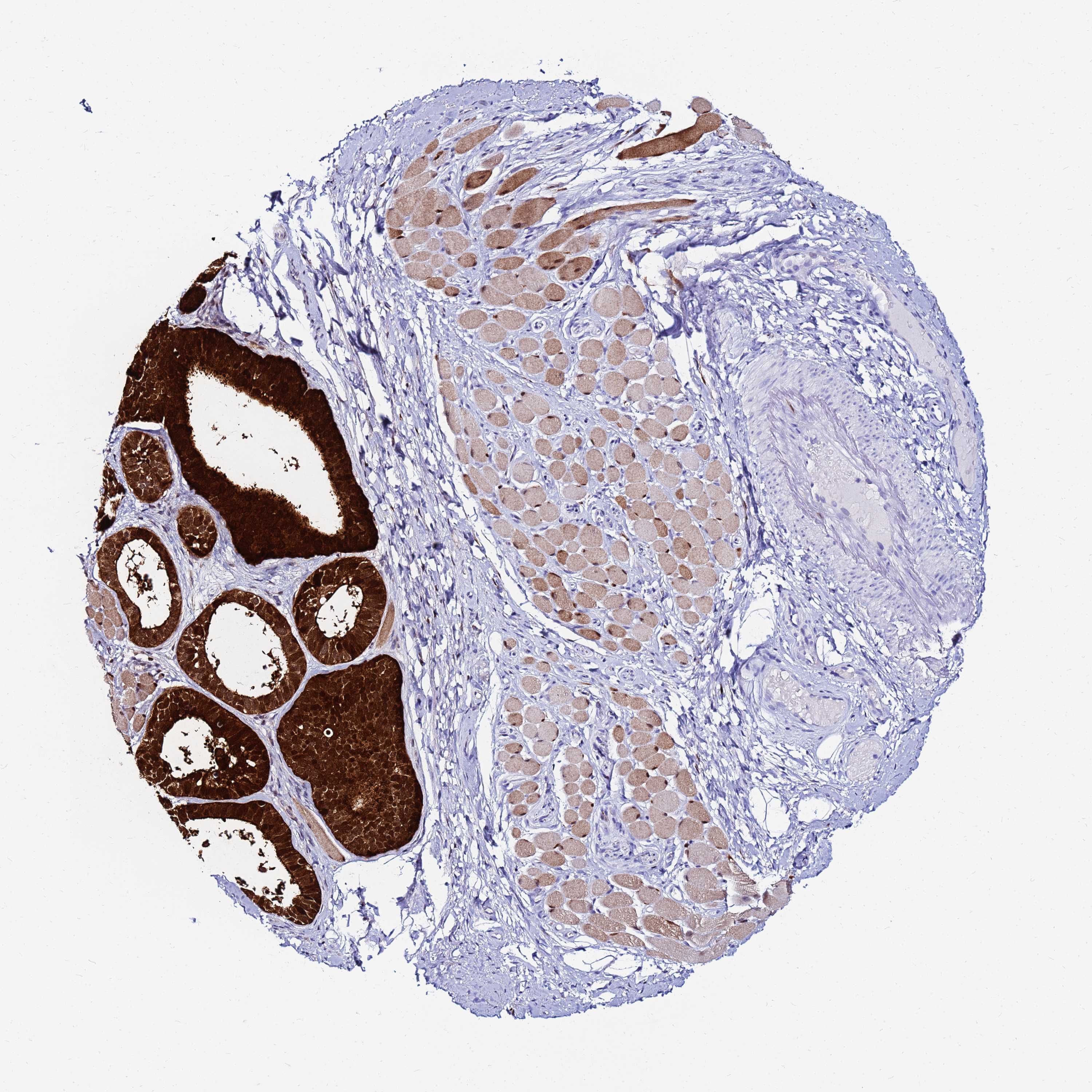 Antibody staining in the annotated cell types in the current human tissue is reported as not detected, low, medium, or high, based on conventional immunohistochemistry profiling in selected tissues. This score is based on the combination of the staining intensity and fraction of stained cells.