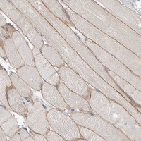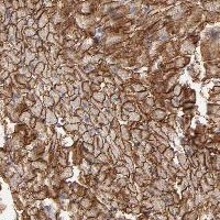 Immunohistochemical staining of human heart muscle shows strong cytoplasmic and membranous positivity in myocytes.