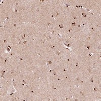 Immunofluorescent staining of human cell line MCF-7 shows localization to nucleoplasm.