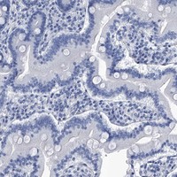 Immunohistochemical staining of human fallopian tube shows strong membranous positivity in glandular cells.
