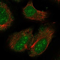 Immunofluorescent staining of human cell line U2OS shows localization to nucleoplasm.