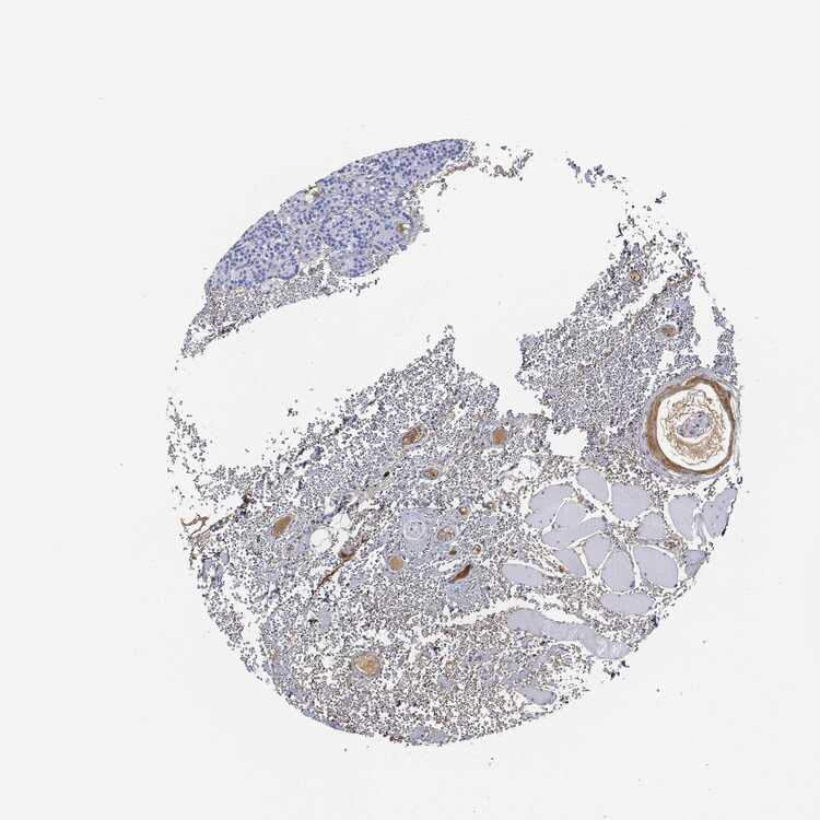 Antibody staining in the annotated cell types in the current human tissue is reported as not detected, low, medium, or high, based on conventional immunohistochemistry profiling in selected tissues. This score is based on the combination of the staining intensity and fraction of stained cells.