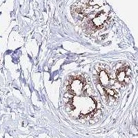 Immunohistochemical staining of human breast shows strong cytoplasmic and membranous positivity in glandular cells.