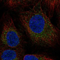 Immunofluorescent staining of human cell line U2OS shows localization to nucleoplasm, vesicles and cytosol.