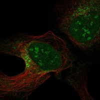 Assay for determining the subcellular location of the encoded protein(s) in human cells by indirect immunofluorescence and confocal microscopy. The antibody-based staining is generally carried out in U2OS and two additional cell lines, selected based on RNA expression. Representative multi-color images showing the protein of interest in green are displayed below. The images also include markers for the nucleus (blue), microtubules (red) and ER (yellow). All images are clickable for an enlarged view. For cell structure reference, visit the cell dictionary.