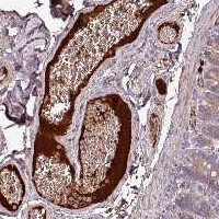 Immunohistochemical staining of human rectum shows positivity in plasma.