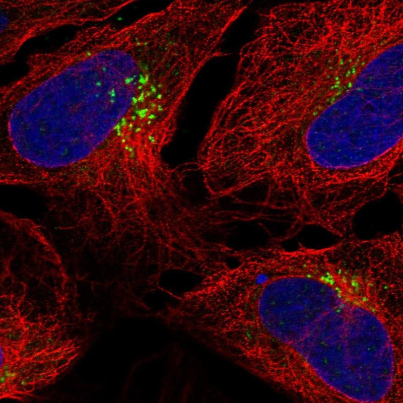 Immunofluorescent staining of human cell line U2OS shows localization to the Golgi apparatus.
