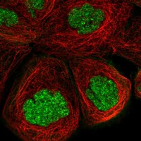 Immunofluorescent staining of human cell line A-431 shows localization to nucleoplasm.